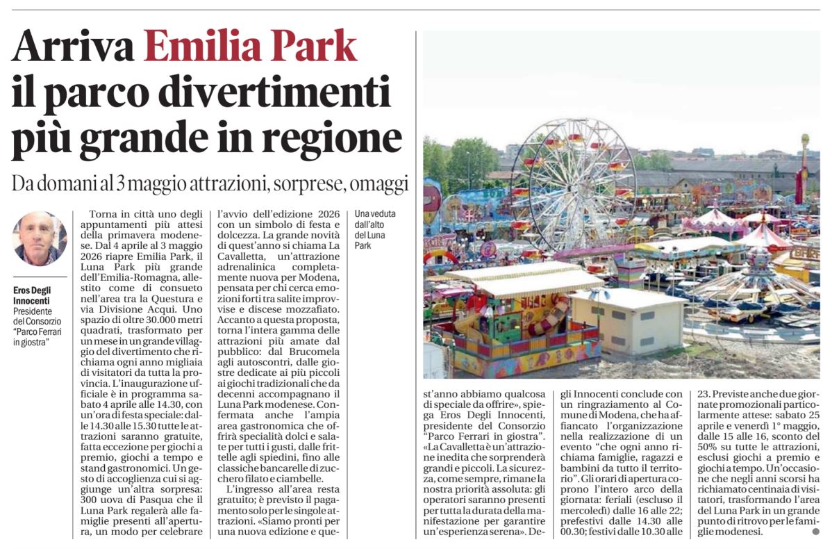 Modena, 3 aprile 2026Rassegna stampaCONFESERCENTI MODENAArriva Emilia Park, il parco divertimenti più grande in regione3/4/26 – Gazzetta di Modena