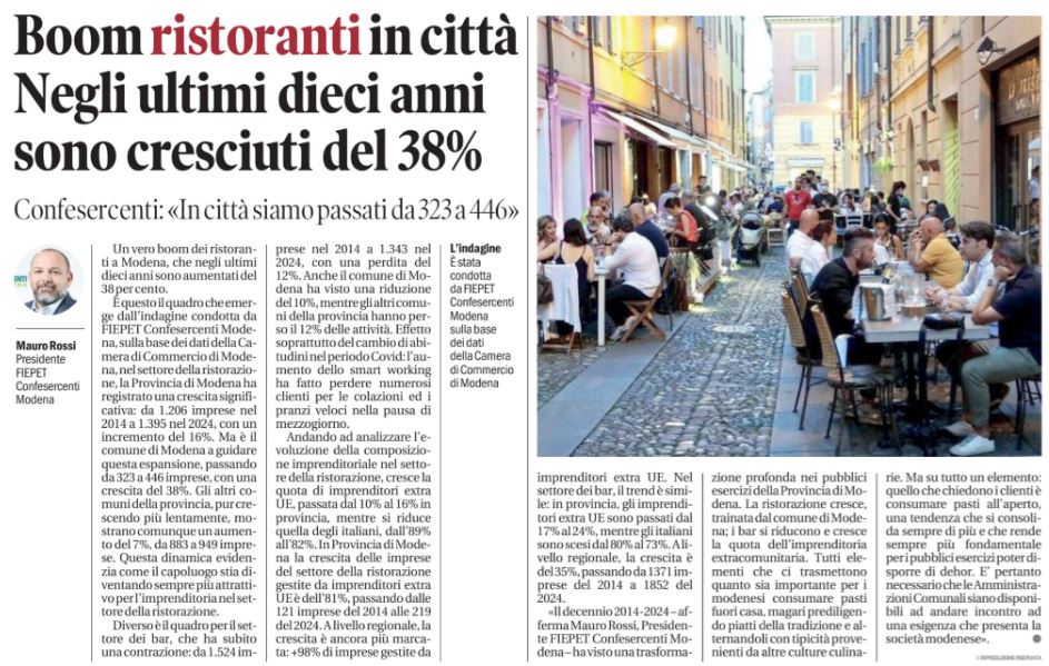 Modena, 08 ottobre 2025Rassegna stampaCONFESERCENTI MODENABoom di ristoranti in città. Negli ultimi dieci anni sono cresciuti del 38%08/10/25 – Gazzetta di Modena