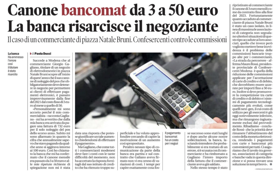 AgosModena, 20 marzo 2023Rassegna stampaCONFESERCENTI MODENACanone bancomat da 3 euro e 50. La banca risarcisce il commerciante20/03/2023 – Gazzetta di Modena