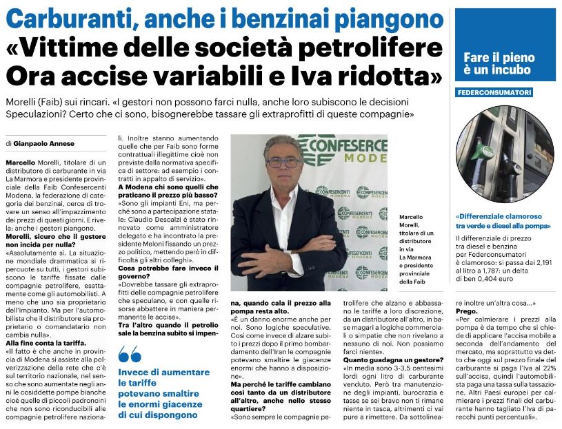 Modena, 11 aprile 2026Rassegna stampaCONFESERCENTI MODENACarburanti, anche i benzinai piangono. “Vittime delle società petrolifere. Ora accise variabili e Iva ridotta”11/4/26 – Resto del Carlino
