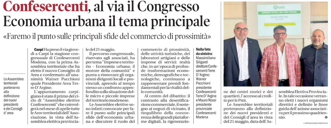 Carpi, 11 aprile 2026Rassegna stampaCONFESERCENTI MODENACarpi. Confesercenti, al via il Congresso. Economia urbana il tema principale11/4/26 – Gazzetta di Modena