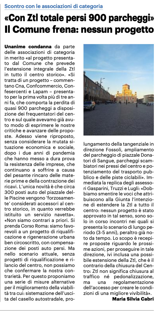 Modena, 27 maggio 2022Rassegna stampa CONFESERCENTI CARPI“Con Ztl totale persi 900 parcheggi”. Il Comune frena: nessun progetto27/05/2022 – Resto del Carlino