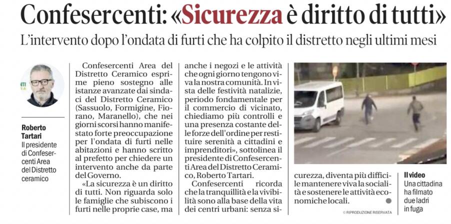 Modena, 4 dicembre 2025Rassegna stampaCONFESERCENTI MODENAConfesercenti Area del Distretto Ceramico: “Sicurezza è diritto di tutti”4/12/25 – Gazzetta di Modena