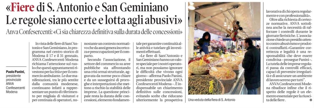 Modena, 16 gennaio 2026Rassegna stampaCONFESERCENTI MODENAFiere di Sant’Antonio e San Geminiamo. Le regole siano certe e lotta agli abusivi16/1/26 – Gazzetta di Modena