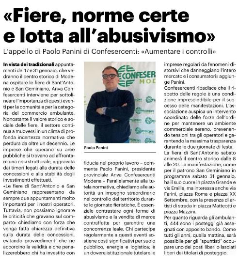 Modena, 16 gennaio 2026Rassegna stampaCONFESERCENTI MODENA “Fiere, norme certe e lotta all’abusivismo” 16/1/26 – Resto del Carlino