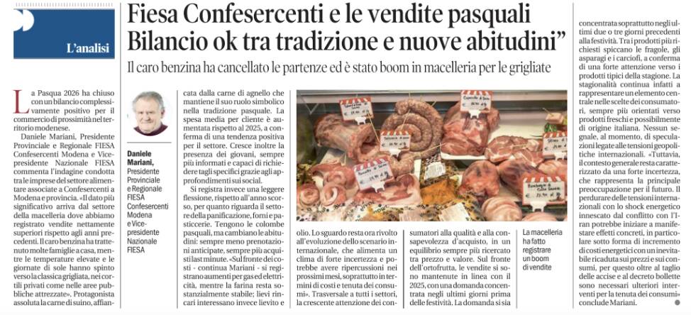 Modena, 22 aprile 2026Rassegna stampaCONFESERCENTI MODENAFiesa Confesercenti e le vendite pasquali. “Bilancio ok tra tradizione e nuove abitudini”22/4/26 – Gazzetta di Modena