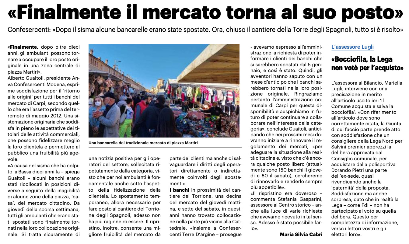 Modena, 12 gennaio 2023Rassegna stampaCONFESERCENTI MODENA“Finalmente il mercato torna al suo posto” 12/01/23 – Resto del Carlino