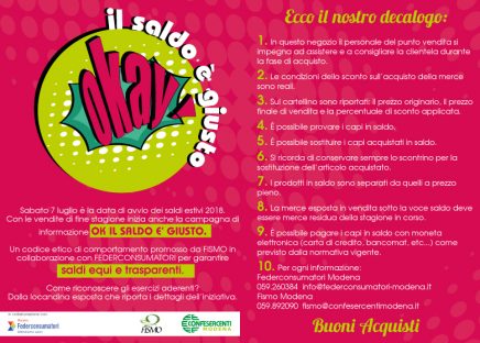 Un decalogo, che si presenta come il giusto punto di incontro tra il negoziante ed il cliente per la tutela di entrambi. Questo è “Okay il saldo è giusto”, l’iniziativa messa a punto da FISMO-Confesercenti Modena e Federconsumatori che prenderà il via in occasione dei prossimi saldi estivi in partenza sabato 7 luglio 2018. Dall’assistenza al cliente, alla garanzia dello sconto reale partendo dal prezzo originario debitamente riportato sul cartellino, fino alla possibilità di poter saldare con carte di credito o bancomat. Un’insieme di regole, note forse, ma utili in quanto valore aggiunto del punto vendita e volte a facilitare l’acquisto di un capo di abbigliamento, oltre che in questo modo fidelizzare il cliente.