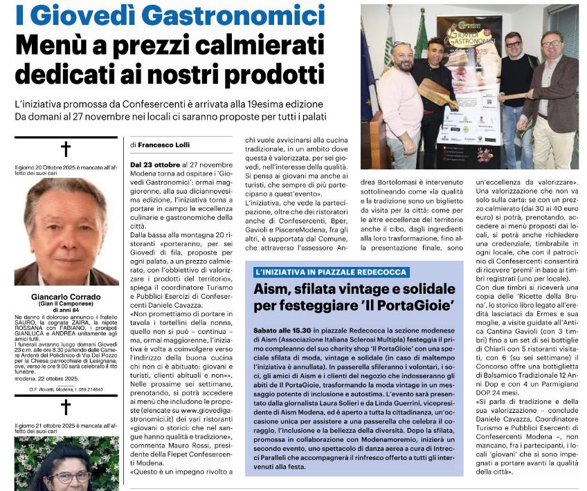 Modena, 22 ottobre 2025Rassegna stampaCONFESERCENTI MODENAI Giovedì Gastronomici. Menù a prezzo calmierati dedicati ai nostri prodotti 22/10/25 – Resto del Carlino
