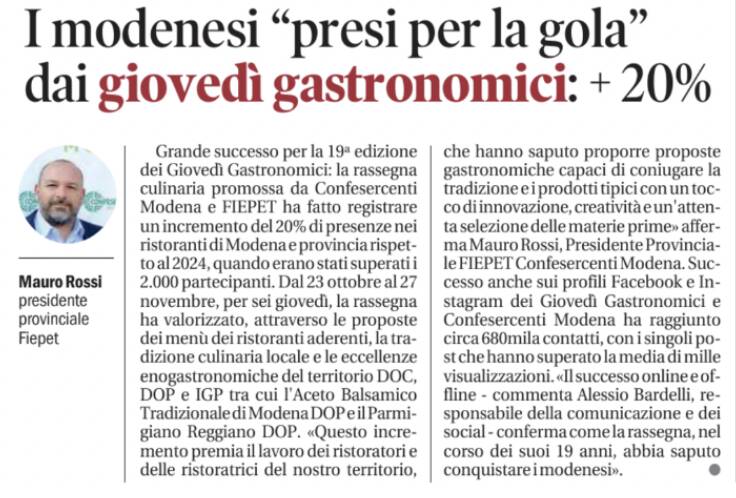 Modena, 6 dicembre 2025Rassegna stampaCONFESERCENTI MODENAI modenesi presi per la gola dai Giovedì Gastronomici: + 20%6/12/25 – Gazzetta di Modena