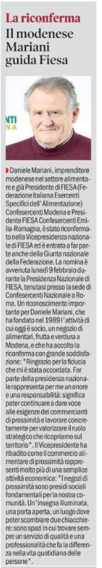 Modena, 11 febbraio 2026Rassegna stampaCONFESERCENTI MODENA Il modenese Mariani guida Fiesa11/2/26 – Gazzetta di Modena