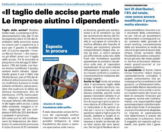 Modena, 22 marzo 2026Rassegna stampaCONFESERCENTI MODENA“Il taglio delle accise parte male. Le imprese aiutino i dipendenti”22/3/26 – Resto del Carlino