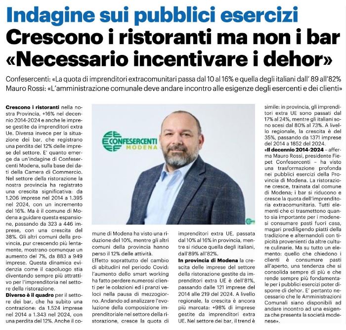 Modena, 10 ottobre 2025Rassegna stampaCONFESERCENTI MODENAIndagine sui pubblici esercizi. “Crescono i ristoranti ma non i bar. Necessario incentivare i dehor”10/10/25 – Resto del Carlino