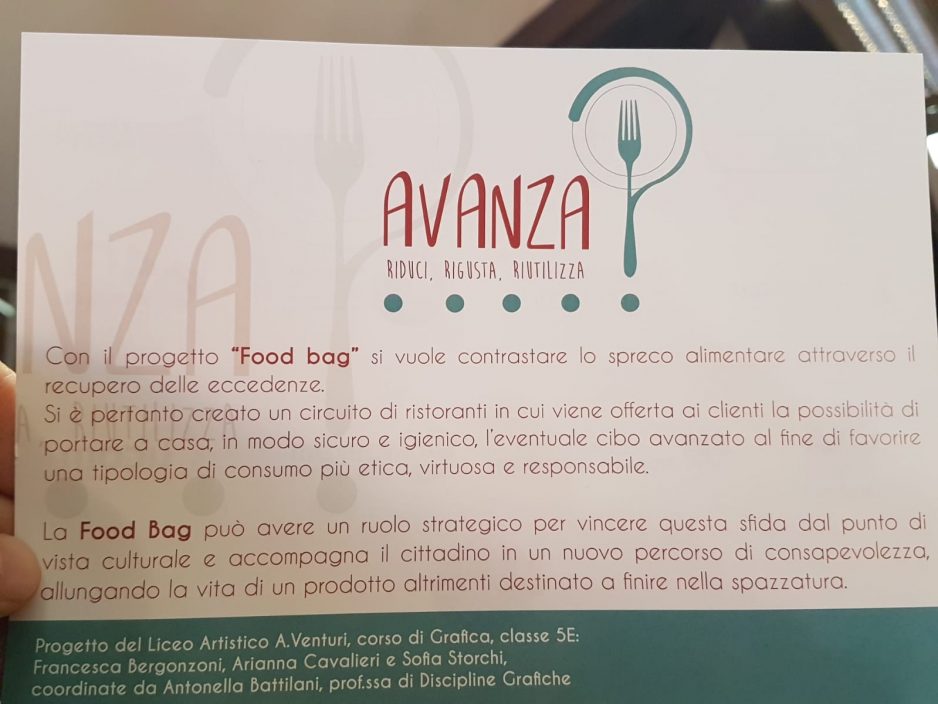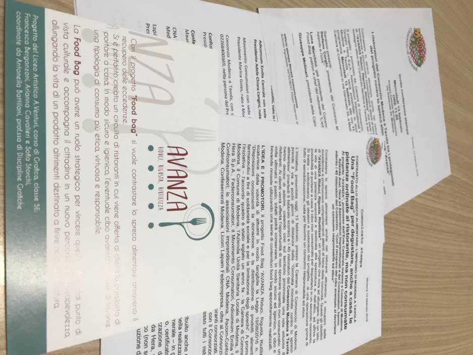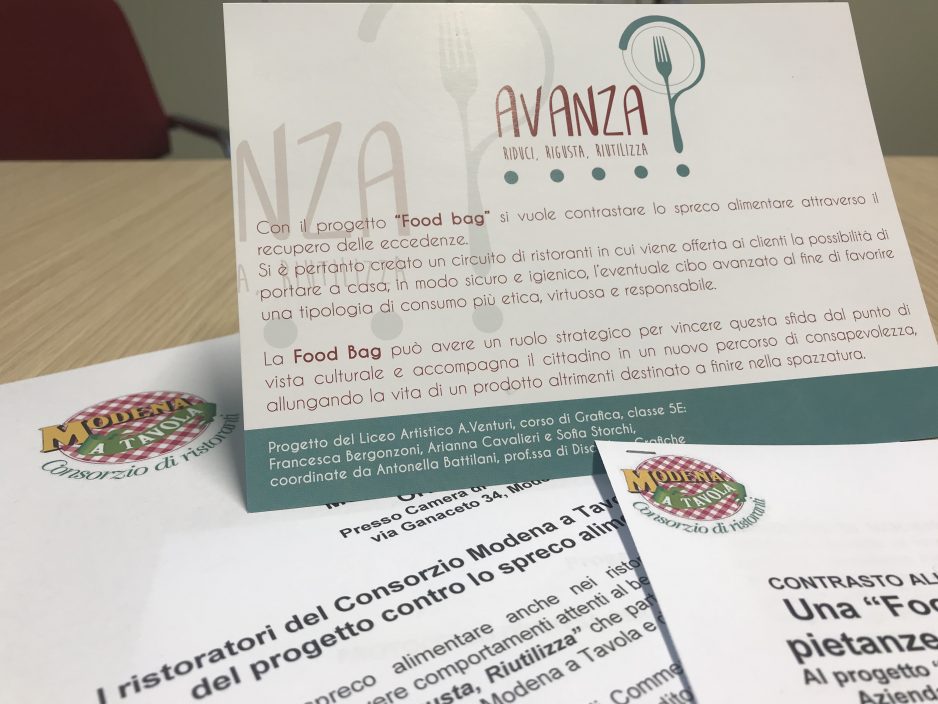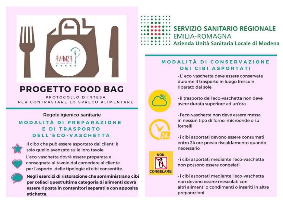 L’IDEA E I PROMOTORI. Il progetto Food Bag “AVANZA Riduci, Rigusta, Riutilizza”, scaturisce dalla volontà di attuare in modo tangibile la Legge 19/08/2016 n. 166, “Disposizioni concernenti la donazione e la distribuzione di prodotti alimentari e farmaceutici a fini di solidarietà sociale e per la limitazione degli sprechi”. A promuovere l’iniziativa – l’accordo quadro è stato siglato un anno fa – la Camera di Commercio di Modena, il Comune di Modena, l’Azienda Unità Sanitaria Locale di Modena, il Gruppo Hera S.p.A., Federconsumatori, il Movimento Consumatori, Adiconsum Emilia Centrale, Confconsumatori; le associazioni imprenditoriali CNA Modena, Ascom-Confcommercio Modena, Confesercenti Modena, Licom Lapam Federimpresa, oltre al Consorzio Modena a Tavola che ha scelto di aderire all’iniziativa con tutti i 40 ristoranti consorziati. La CCIAA inoltre, in collaborazione con le Associazioni Imprenditoriali e con il Consorzio Modena a Tavola, sosterrà una promozione capillare dell’iniziativa presso tutti i ristoratori della provincia.