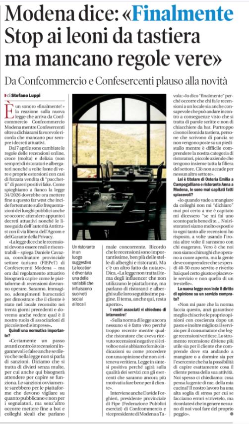 Modena, 11 aprile 2026Rassegna stampaCONFESERCENTI MODENAModena dice: “Finalmente. Stop ai leoni da tastiera ma mancano regole vere”11/4/26 – Gazzetta di Modena