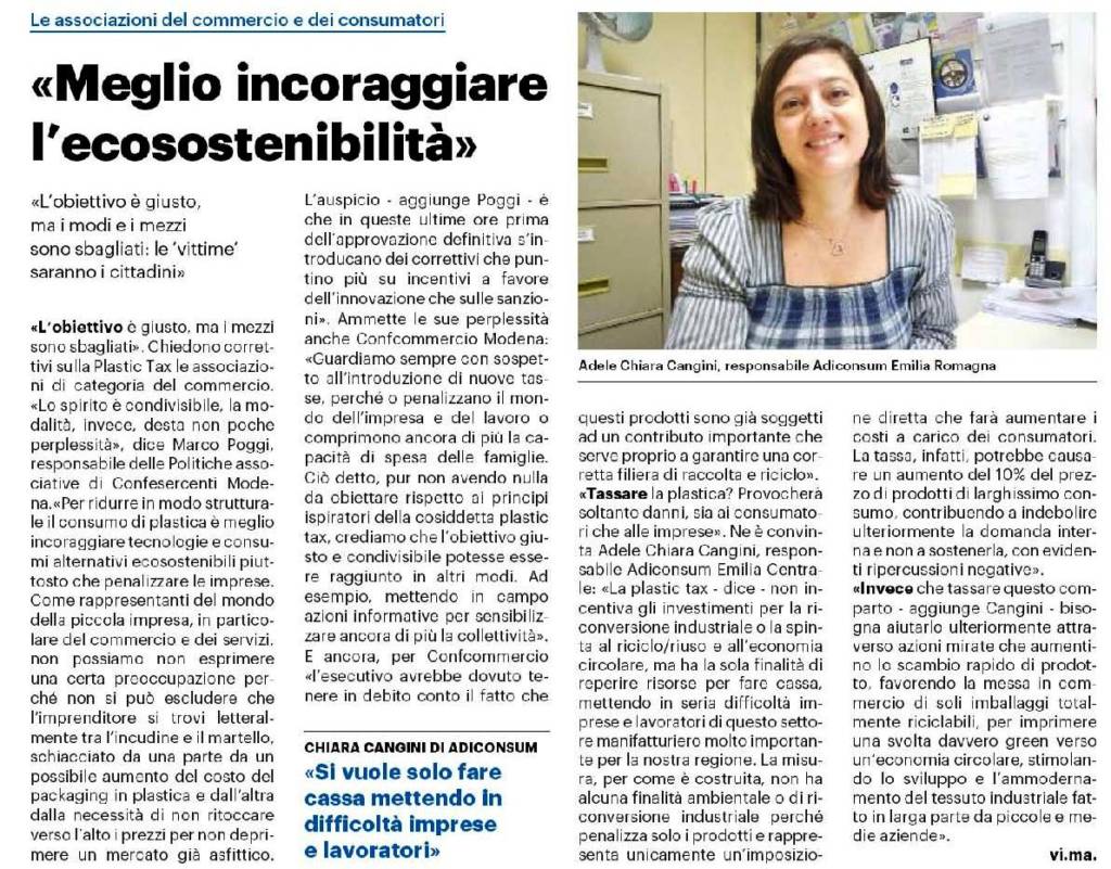 «Lo spirito è condivisibile, la modalità, invece, desta non poche perplessità», dice Marco Poggi, responsabile delle Politiche associative di Confesercenti Modena. «Per ridurre in modo strutturale il consumo di plastica è meglio incoraggiare tecnologie e consumi alternativi ecosostenibili piuttosto che penalizzare le imprese. Come rappresentanti del mondo della piccola impresa, in particolare del commercio e dei servizi, non possiamo non esprimere una certa preoccupazione perché non si può escludere che l’imprenditore si trovi letteralmente tra l’incudine e il martello, schiacciato da una parte da un possibile aumento del costo del packaging in plastica e dall’altra dalla necessità di non ritoccare verso l’alto i prezzi per non deprimere un mercato già asfittico. L’auspicio – aggiunge Poggi – è che in queste ultime ore prima dell’approvazione definitiva s’introducano dei correttivi che puntino più su incentivi a favore dell’innovazione che sulle sanzioni ».
