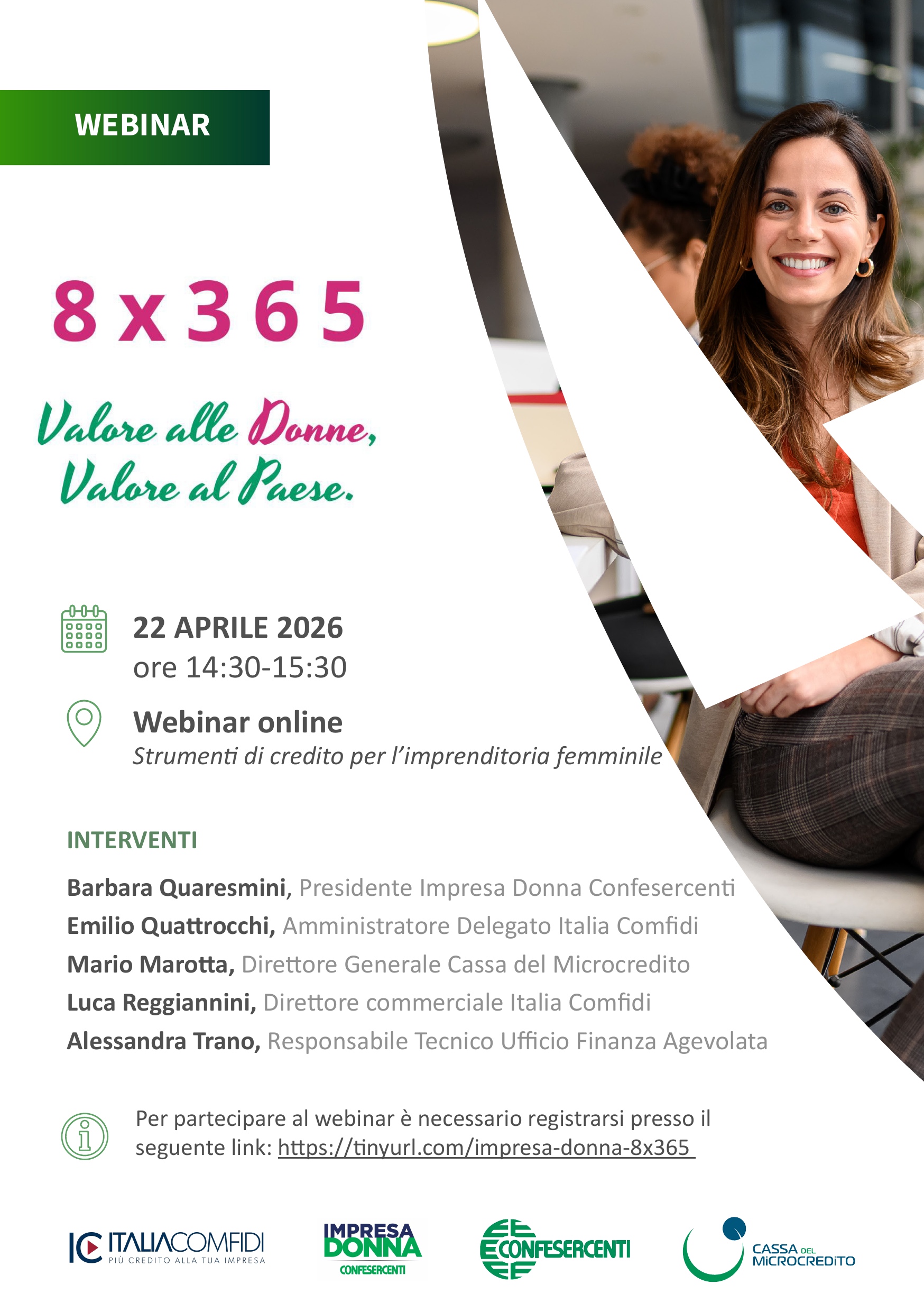 Per partecipare al webinar è necessario registrarsi presso il seguente link: https://tinyurl.com/impresa-donna-8×365