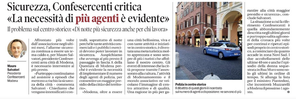 Modena, 24 luglio 2023Rassegna stampaCONFESERCENTI MODENASicurezza, Confesercenti critica. “La necessità di più agenti è evidente”24/07/2023 – Resto del Carlino