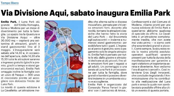 Modena, 2 aprile 2026Rassegna stampaCONFESERCENTI MODENAVia Divisioni Acqui, sabato inaugura Emilia Park2/4/26 – Resto del Carlino