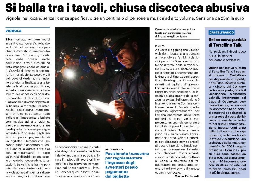 Vignola, 4 aprile 2026Rassegna stampaCONFESERCENTI MODENAVignola. Si balla tra i tavoli, chiusa discoteca abusiva4/4/26 – Resto del Carlino