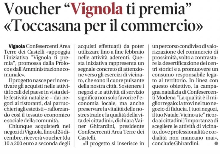 Vignola, 7 dicembre 2025Rassegna stampaCONFESERCENTI MODENAVoucher “Vignola ti premia”: toccasana per il commercio7/12/25 – Gazzetta di Modena